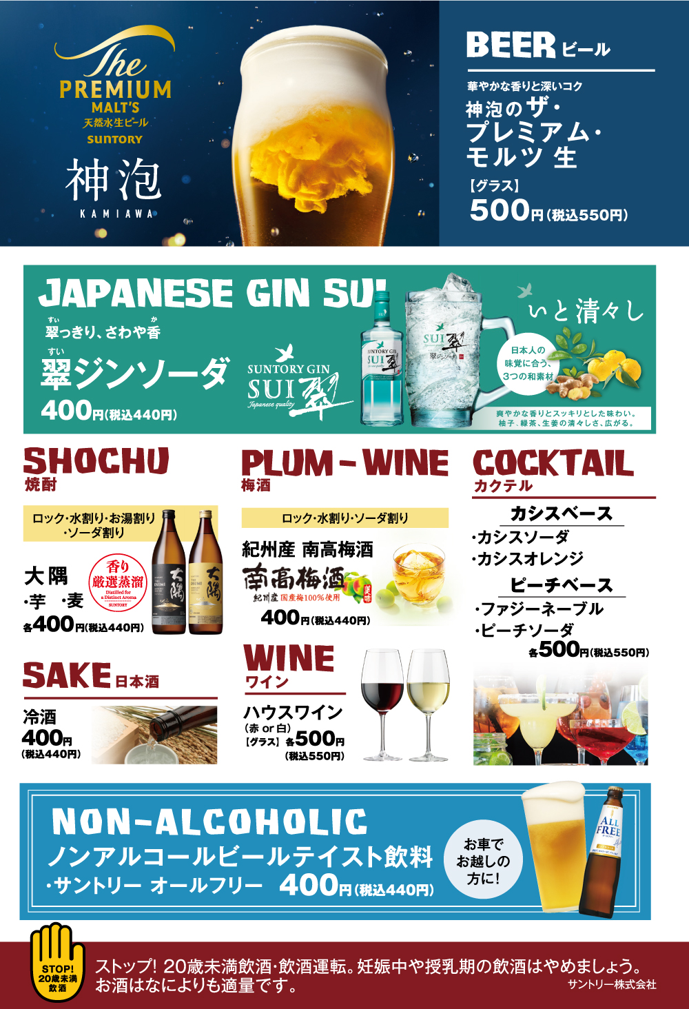 「ザ・プレミアム・モルツ」や「角ハイボール」、「カクテル」などのアルコールメニューは別料金で飲み放題に!
