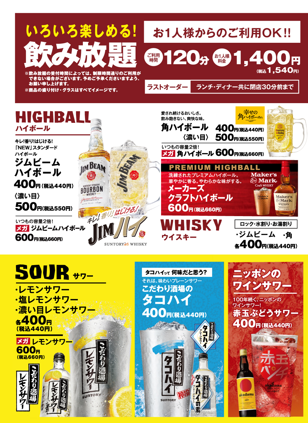 ※4月1日(水)よりアルコール飲み放題料金は全店1,400円(税込1,540円)となります。